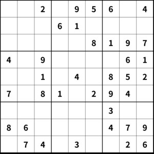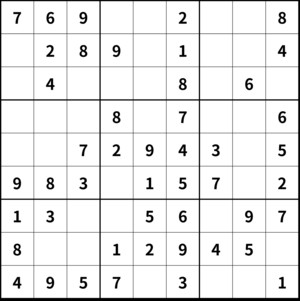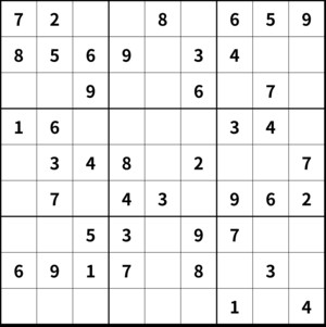 ※ 스도쿠 규칙: 숫자 1~9를 ①세로 9칸에 한 번씩만 써서 채운다. ②가로 9칸에도 한 번씩만 써서 채운다. ③굵은 선의 작은 사각형 3칸×3칸에도 한 번씩만 써서 채운다.