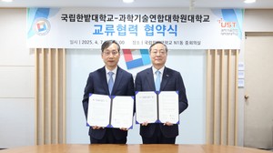 국립한밭대는 과학기술연합대학원대(UST)와 혁신역량 강화 및 지역혁신 성장기여를 위한 교류협력을 확대하는 업무협약을 체결했다고 8일 밝혔다.양 대학은 이번 협약을 통해 글로컬대학30 사업과 지역혁신중심 대학지원체계(RISE) 사업을 포함해 협력 프로그램을 확대하기로 했다. 이어 지·산·학·연 협력 생태계 구축을 기반으로 인재양성과 지역혁신 성장에 대해서도 힘을 모으기로 약속했다.특히 대학과 출연연 벽 허물기에 협력하기로 약속했다. 교원과 우수 연구자 교류를 비롯해 출연연과 연계한 첨단산업분야 교육과정 운영, 지역특화산업 분야 연계강