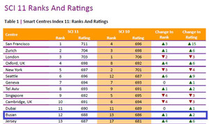 부산시가 세계 지능형 스마트 도시평가에서 12위, 아시아 2위를 달성하면서 스마트 도시로 부상하고 있다.4일 시에 따르면 영국 컨설팅 전문기관 지옌(Z/YEN)사가 발표한 세계 지능형센터 지수(글로벌 스마트센터 지수, SCI) 11회차 평가에서 전 세계 주요 도시 76곳 가운데 12위를 차지했다고 밝혔다.이번 평가에서 1∼5위는 샌프란시스코, 취리히, 런던, 옥스포드, 뉴욕순으로 아시아·태평양 지역에서는 부산은 전체 9위인 싱가포르에 이어 2위를 달성했다.특히 첨단기술 분야 12위를 비롯해 금융지원 분야 13위, 인적자원 분야 9위