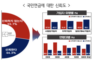 국민연금에 대한 국민 신뢰도가 다소 높지 않은 것으로 나타났다. 한국경영자총협회는 연금개혁 동력 유지를 위해 국민들에게 ‘낸 만큼 돌려받을 수 있다’는 확신을 심어줘야 한다고 제언했다. 경총이 모노리서치에 의뢰해 실시한 ‘2025 국민연금 현안 대국민 인식조사’ 결과에 따르면 국민연금에 대한 신뢰도를 묻는 질문에 ‘신뢰하지 않는다’는 응답은 55.7%로 ‘신뢰한다’는 응답(44.3%)보다 11.4%p 높았다.가입유형별에선 자발적 가입 의사 여부에 따라 갈렸다. 사업장가입자와 지역가입자에서는 ‘신뢰하지 않는다’는 응답이 사업장가입자