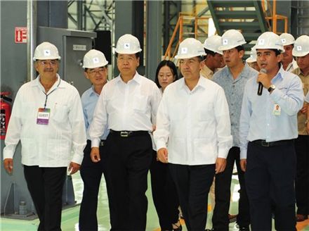 2009년 8월 멕시코 연속아연도금(CGL) 공장 준공식에 참석한 포스코 정준양 회장(왼쪽에서 두번째)과 펠리페 깔데론 멕시코 대통령(가운데)이 공장 내부를 둘러보고 있다.