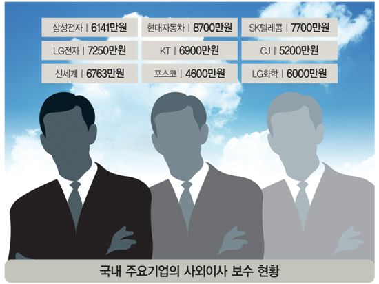 사외이사 보수가 가장 높은 곳은 현대자동차로 연간 평균 보수가 8700만원에 달했다. 현대자동차에 이어 사외이사 보수를 많이 지급한 기업은 SK텔레콤으로 7700만원이었다. 또 시가총액 순위 1위인 삼성전자는 1인당 6141만원을 지급했으며 LG전자 사외이사는 연간 7250만원을 받았다.