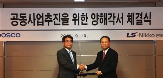 강성원 LS-Nikko 동제련 대표이사 사장과 윤용원 포스코 성장투자부문 전무가 최근 삼성동 아셈타워에 있는 LS-Nikko 대회의실에서 서로 손을 맞잡고 밝은 표정으로 미소를 지었다.