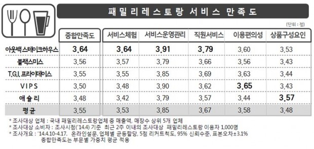 종합 1위에 오른 아웃백스테이크하우스는 전체 5개 부문별 만족도에서 △서비스 체험 3.64점(이용 과정에서의 만족감 등) △서비스 운영·관리 3.91점(예약의 정확성 및 할인서비스 안내 등) △직원 서비스 3.79점(고객 응대, 직원 친절 등) 등 3개 부문에서 최고를 기록했다.
