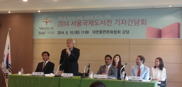 '2014 서울국제도서전'을 앞두고 서울시 사간동 대한출판문화협회 강당에서 기자간담회가 열렸다. 왼쪽부터 이대철 서울국제도서전 집행위원장, 고영수 대한출판문화협회 회장, 모하메드 알하르시 주한 오만 대사, 안젤로 조에 주한 이탈리아 문화원장. [사진=이코노믹리뷰 배병우 기자]‘책으로 만나는 세상, 책으로 꿈꾸는 미래’를 캐치프레이즈로 한 이번 서울국제도서전은 주빈국 오만과 컬처 포커스국으로 참여하는 이탈리아를 비롯한 세계 23개국의 국내외 출판사 369개사가 참가해 인문사회‧과학 등 일반도서와 아동도서를 포함한 출판 전 분야의 신‧구간 도서를 전시한다.