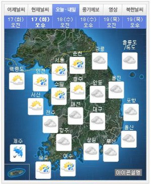 경남 남해안은 오후부터 밤 사이, 강원 동해안은 오후부터 18일 아침 사이에 산발적인 비가 예상되며 경기내륙과 강원도 영서 일부 지역에는 오후부터 밤사이 소나기(강수확률 60%)가 오는 곳이 있겠다.
