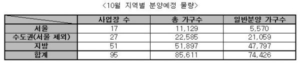 30일 부동산써브에 따르면 10월 분양시장은 전국 95개 사업장에서 총 8만5611가구 중 7만4426가구(장기전세 및 국민임대 제외, 오피스텔 포함)가 일반분양될 예정이다. 이는 전월(9월 5만2449가구) 대비 2만1977가구 증가한 물량이다.