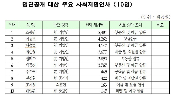 특히, 이번 공개 대상자 중에는 대기업 회장, 전직 고위 공무원, 종교인 등 사회지도층이 다수 포함돼 있어 이들에 대해 사회저명인사로 분류해 지속 특별 관리한다는 계획이다.