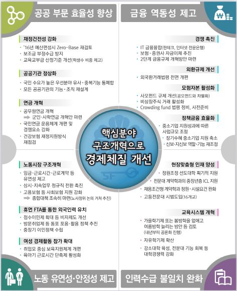 정부가 국내 경제의 지속적이고 안정적인 성장을 위해 공공ㆍ노동ㆍ교육ㆍ금융 등 핵심 분야를 중심으로 구조개혁을 추진해 경제활력을 높이기로 했다.