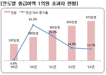 지난해 총급여액 1억원이 넘는 고액연봉자는 47만2000명으로 ’12년 41만5000명에 비해 13.7% 증가한 것으로 나타났다.
