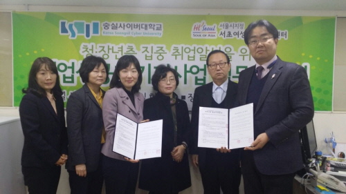 지난 27일 숭실사이버대학교와 서초여성인력개발센터가 상호 협력적 관계를 통한 청년층 취업지원을 목표로 업무협약을 체결했다. 이번 협약식에는 문순희 주임, 엄미선 사회복지학과 교수, 김선아 교수(사회복지학과장), 사회복지학과 동문 손은주, 동문회장 정동광, 이한승 관장이 참석했다.