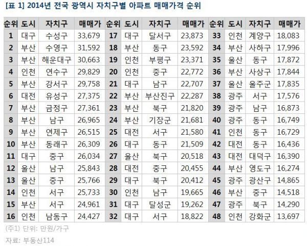 부동산 114에 따르면 2014년 말 기준 대구의 아파트 가구당 평균가격은 2억 4,463만원으로 서울(5억 3,086만원)과 경기(2억 9,230만원)에 이어 전국에서 세 번째로 아파트 가격이 비싼 지역으로 등극했다.