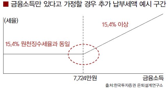 금융소득종합과세란 개인별 연간 금융소득(이자소득+배당소득)이 2000만원을 초과할 시 다른 종합소득(사업·근로소득 등)과 합산해 과세하는 것을 의미한다. 금융소득이 2000만원을 넘을 경우 15.4%의 세부담으로 끝나는 것이 아니라 다른 종합소득과 합산해 종합소득세를 신고해야 한다. 이때 과세표준별 누진세가 적용되면서 적게는 6.6%, 많게는 41.8%의 세부담이 늘어난다. 세금을 고려하지 않을 경우 일명 ‘국세청 약세장’을 맞이할 수 있는 것이다.