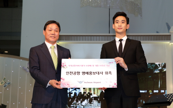 인천국제공항공사는 26일 인천공항 1층 밀레니엄홀에서 배우 김수현을 인천공항 명예홍보대사로 임명하는 위촉식을 가졌다.