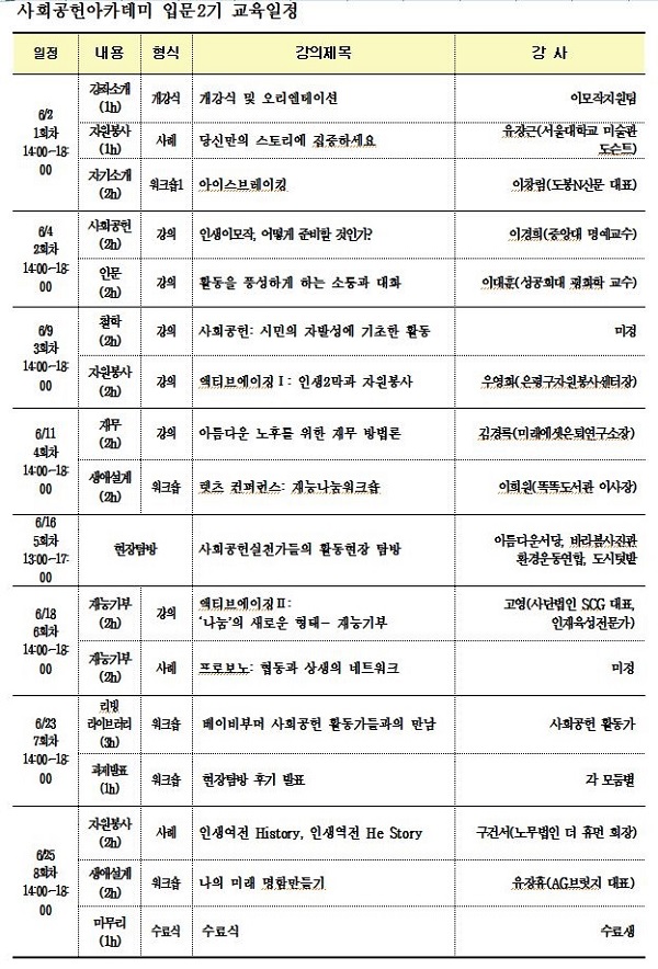 오는 28일부터 시작하는 사회공헌아카데미 입문1기 과정은 5월 26일까지 주 2회(화, 목요일) 총 8회로 진행되며, 입문 2기 과정은 6월 2~25일 열린다.