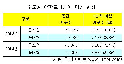 반면 중대형 분양물량 청약 1순위 마감 현황은 11.0% 포인트(2013년 38.3%, 2014년 49.3%) 증가했다. 같은 기간 중소형 1순위 마감은 3.3% 포인트(2013년 16.1%, 2014년 19.4%)만 늘어나는데 그쳤다.