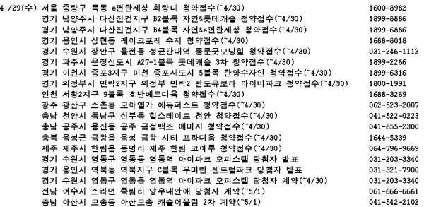 24일 부동산써브에 따르면 4월 마지막주에는 청약접수 21곳, 당첨자 발표 15곳, 당첨자 계약 20곳, 견본주택 개관 6곳 등이 예정돼 있다.