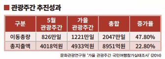 한국문화관광연구원이 발표한 ‘가을 관광주간 국민여행참가실태조사(2014)’에 따르면 관광주간이 첫 시행됐던 작년 주간 이동총량은 2047만일, 소비 지출액 8951억달러를 달성해 각각 47.8%, 22.8%의 증가율을 나타내며 합격점을 받았다.