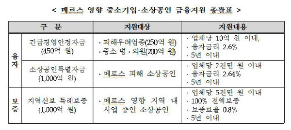 이에 따라, 관광·여행·공연 등 메르스 확산에 따른 피해우려 업종 중소기업에 업체당 10억 원 이내에서 총 250억원 제공된다. 적용 금리는 통상 금리 대비 1.28%포인트 인하된 2.6%(변동).