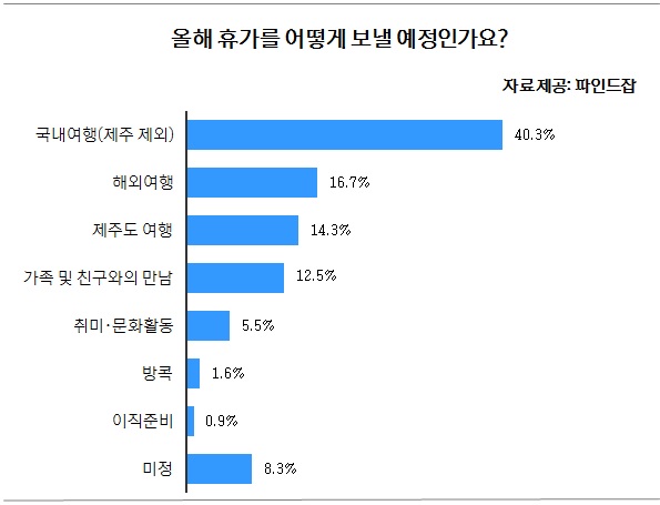 이어 ‘해외여행’(16.7%), ‘가족 및 친구와의 만남’(12.5%), ‘취미·문화활동’(5.5%), ‘방콕’(1.6%), ‘이직준비’(0.9%) 순으로 이어졌고, 계획이 아직 없다는 응답은 8.3%였다.