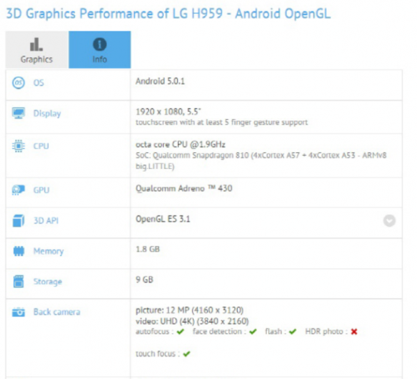 당시에는 모델명 LG H959은 5.5인치 1080P 디스플레이와 스냅드래곤 810 AP, 아드레노 430 GPU, 2GB RAM 사양이었으나 러시아의 매체는 5.2인치 풀HD 디스플레이를 탑재했다고 밝혔다.