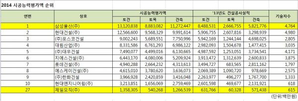 제일모직의 상황도 삼성물산과 비슷하다. 조경·에너지 절감·중층 빌딩 등에 특화된 장점을 가지고 있는 제일모직 건설사업부(옛 삼성에버랜드)는 지난해 시공능력평가에서 27위를 차지했다.