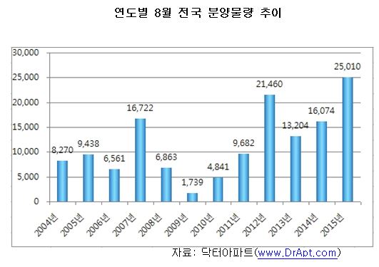 29일 닥터아파트에 따르면 8월에 전국에서 분양예정인 아파트는 40곳, 2만5010가구(주상복합 포함, 임대 제외)로 2004년 이후 역대 최대 물량이다. 지난 2012년 2만1460가구를 뛰어넘으며, 전년동기(1만6074가구)와 비교해도 55.6% 늘어난 수치다.