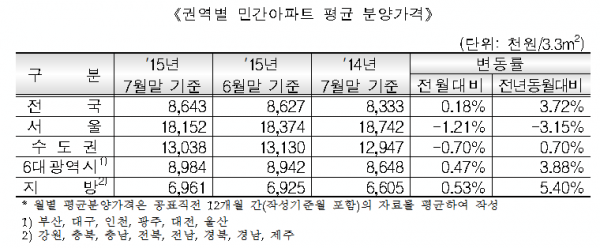 한편 충북(-1.22%), 서울(-1.21%), 경기(-0.52%) 지역 순으로 민간아파트 평균 분양가격이 지난달에 비해 가장 크게 하락한 것으로 나타났다. 7월 충북 지역의 평균 분양가격 하락은 괴산군과 영동군, 옥천군, 제천시, 증평군 등 주로 충북 지역 평균 분양가격 대비 분양가가 낮은 지역에서 최근 신규아파트 분양이 증가한 것이 평균 분양가격 하락의 원인으로 분석됐다.