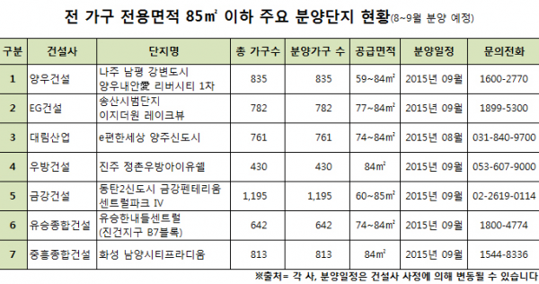 이 밖에 올 상반기 청약자들로 북적이던 동탄2신도시를 비롯해 남양주, 화성 등지에서도 전 가구 전용면적을 85㎡ 이하 중소형으로 맞춘 단지가 9월 분양에 나설 예정이다. 금강건설이 오는 9월 경기 화성 동탄2지구 A-46블록에 분양 예정인 `동탄2신도시 금강펜테리움 센트럴파크 Ⅳ`는 전용면적 60㎡~ 85㎡ 이하 중소형 1195가구 규모로 조성될 전망이다.