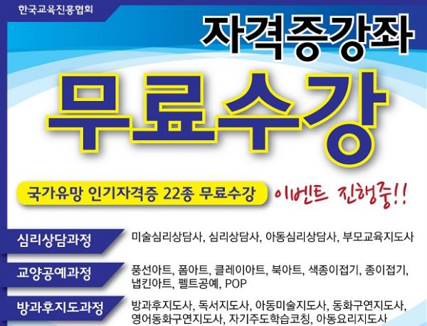 한국교육진흥협회는 재능기부의 일환으로 민간자격증 중에서 방과후지도과정, 심리상담과정, 교양공예과정의 각 인기자격증 22종을 무료수강으로 진행중이다.