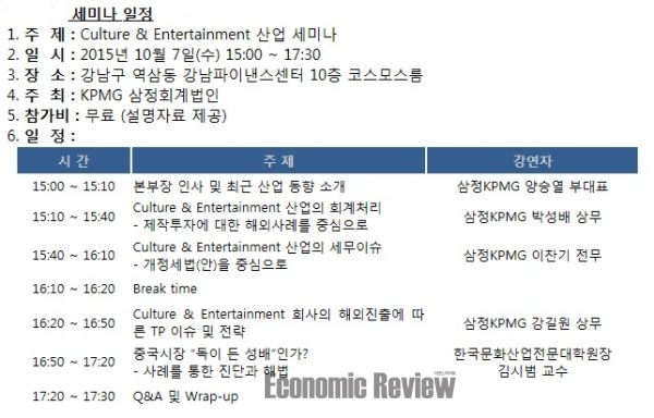 국내 대형 회계법인 삼정KPMG(대표이사 김교태)가 오는 7일 역삼동 강남파이낸스센터 10층 본사에서 ‘제 2 회 Culture & Entertainment 산업 세미나’를 개최한다고 5일 밝혔다.