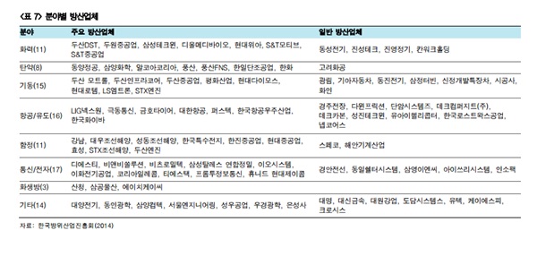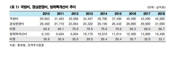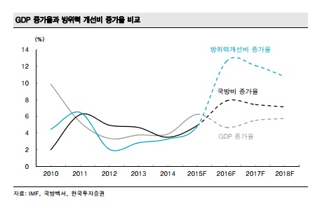 국방예산 증가율은 기본적으로 한국 GDP 증가율을 상회할 것으로 보인다. 한국의 GDP 증가율은 2020년까지 연간 4~6%에 불과할 전망이다. 반면 국방예산 증가율은 연평균 5~7%로 GDP 증가율을 상회할 것이다. 여기에 방위산업 업체들의 실적과 관련되는 방위력 개선비 증가율은 연평균 10%에 달할 것으로 예측된다. 국방예산은 크게 전력운영비와 방위력 개선비로 구분된다. 전력운영비는 현재의 병력과 무기의 유지보수와 관련된 예산이고, 방위력 개선비는 방위력을 개선하는 데 쓰이는 예산을 말한다. 국내 방산업체의 매출액은 대부분 방위력 개선비에서 창출된다. 수입하는 무기도 있지만 대체로 국내 방산업체의 전체 매출액 증가율은 방위력개선비 증가율에 준한다. 결국 국내 방위산업 성장률은 GDP 증가율을 상회할 수 밖에 없다. 정리하자면 GDP 증가율<국방예산 증가율<방위산업 성장률 순이다.