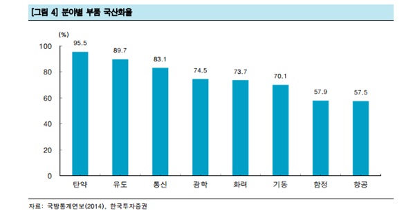 6일 한국투자증권의 ‘감출 수 없는 방산의 매력’ 보고서에 따르면 방위산업은 향후 구조적인 성장세가 펼쳐질 전망이다. 우선 출산이 감소해 징집대상 인구가 줄고 복무기간까지 단축돼 병력 규모가 감소하면서 고도화된 첨단 기계 무기들이 줄어드는 병력을 대체할 것이다. 여기에 북한군에 비해 수적 열위에 있는 분야의 전력 확대가 이어질 것으로 예상된다. 장기적으로는 강대국의 영향권에 있는 한반도의 지정학적 위치를 감안하면 군사력 강화는 필연적이다. 여기에 무기 국산화를 추진하는 정부의 정책도 방위산업 성장 요인으로 작용할 것이라는 분석이다.