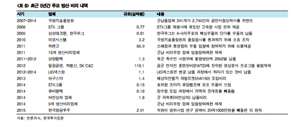 비리 문제도 빼놓을 수 없다. 방위산업의 또 다른 위험요인은 ‘비리’에 있다. 방위산업 분야에 종사하는 정부와 민간업체 관계자들 간에 유기적인 밀착관계가 높아 비리가 끊이지 않고 발생하고 있다. 최근 5년간 적발된 주요 방산 비리의 형태는 1) 시험성적서 위조, 2) 부품 단가 부풀리기, 3) 불량 부품 납품, 4) 금품수수를 통한 편의 제공, 5) 횡령 등이다. 이번 정권은 방산비리 근절을 위해 정부 합동수사단을 발족해 비리를 수사하고 있으며, 무기의 획득 단계에서 방위사업청에 권한이 집중되어 있는 방위사업법을 개정해 방위사업청의 권한을 축소시켰다. 향후에 방산 비리가 재발하지 않는다고 보긴 어렵지만 정부의 이와 같은 노력으로 방산 비리가 줄어들 가능성은 높아질 것이다.