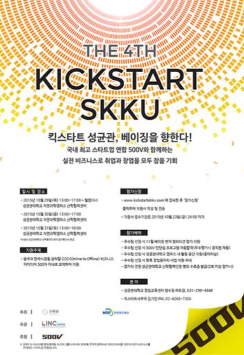 ‘제 4회 킥스타트 성균관, 베이징을 향한다!’라는 캐치프레이즈를 앞세운 이번 행사는 ‘중국과 한국 시장을 공략할 O2O(Online to Offline) 비즈니스 아이디어’라는 주제로 열린다. 선발된 50명의 성균관대학교 및 수도권 소재 대학생을 대상으로 성균관대학교 자연과학캠퍼스 산학협력센터에서 10월 29일부터 3일간 진행된다.