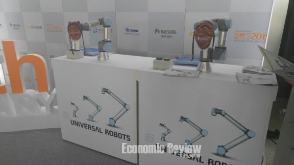 로봇 박람회 ‘2015 로보월드’ 출입구 풍경이다. 이 로봇은 덴마크 유니버설로봇의 신제품 UR3다. 본래 산업 현장에서 사용하기 위해 제작된 로봇이지만 국제 전시회 참가를 기념해 작은 이벤트를 준비한 것이다.