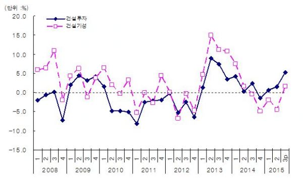 2016년 건설투자는 전년 대비 3.5% 증가해 증가세를 이어갈 전망이다. 2014년에 회복세를 시작한 건설투자 선행지표인 건설수주가 2015년에는 증가세가 확장돼 호조세를 보이면서, 2016년 건설투자에 긍정적 영향을 미칠 것으로 보인다.
