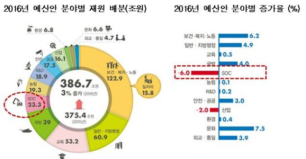 반면, 공공부문의 토목투자는 2016년 정부의 SOC 예산이 전년 대비 약 11% 감소(추경예산 포함)함에 따라 큰 폭으로 줄어들 전망이다.