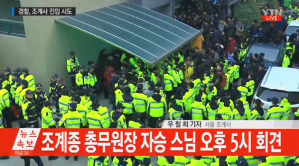 이날 경찰의 공권력 투입에 대해 조계종은 매우 강한 유감을 표명했다. 조계종 총무원장 자승 스님은 기자회견을 열어 "오늘 한상균 위원장에 대한 체포영장을 집행하는 것은 갈등을 해소하는 것이 아니라 또 다른 갈등을 야기하는 것"이라며 내일 정오까지 한 위원장의 거취 문제를 해결할테니 경찰과 민주노총 모두가 행동을 중단하기를 바란다고 요청했다.