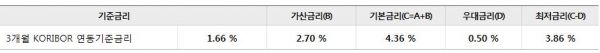 기본금리 : 변동금리 3개월 코리보(KORIBOR) 기준금리 + 가산금리
