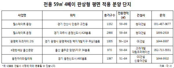 현대건설이 경기 남부권에서 분양중인 '힐스테이트 중앙'과 북부권에서 분양중인 '힐스테이트 운정' 전용면적 59㎡에는 4베이 판상형 평면이 적용됐다. 힐스테이트 중앙은 지하 2층~지상 37층, 8개 동, 전용면적 59~99㎡, 총 1152가구 규모로 이중 조합원 분을 제외한 657가구가 일반분양 대상이다. 전용면적 59㎡A 327가구가 4베이 판상형으로 구성됐으며 드레스룸까지 적용돼 수요자들의 호평을 받은 바 있다. 지하철 4호선 중앙역이 도보권이고, 중앙로, 수인로 등을 통해 수도권 각지는 물론 영동고속도로나 서해안고속도로 진출입이 가능하다.