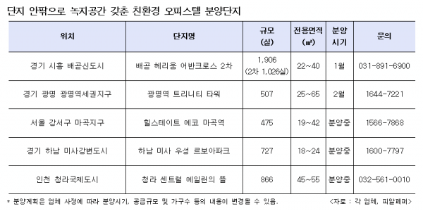 친환경 오피스텔에 대한 관심이 높아지자 건설사들은 교통과 입지는 기본으로 갖추면서 도심에서는 흔치 않은 녹지공간을 단지 내에서 누릴 수 있는 오피스텔을 속속 선보이고 있다.