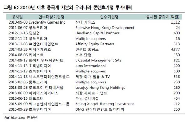 현대증권의 ‘2016년 응답하라 콘텐츠 산업’ 보고서에 따르면 지난 2010년 9월부터 2015년 9월까지 5년 동안 한국 콘텐츠 기업 인수 등에 투자된 중국 자본은 1조92억원에 달한다. 특히 2014년 중국의 한국 직접 투자액은 11.9억달러로 전년 대비 147.2% 급증했다. 이 중 지난 2년에 비해 투자 규모만 74.9%가 늘어난 2113만 달러를 한국의 문화산업 부문에 투자했다.