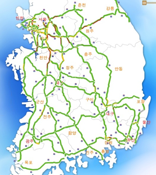 서해안고속도로 목포방향은 비봉나들목~행담도휴게소 총 35.6㎞구간에서 거북이 운행을 하고 있다. 영동고속도로 강릉방향도 신갈분기점~양지나들목, 만종분기점~횡성휴게소, 군자분기점~평창휴게소 등 총 69.4㎞ 구간이 정체를 겪고 있다.