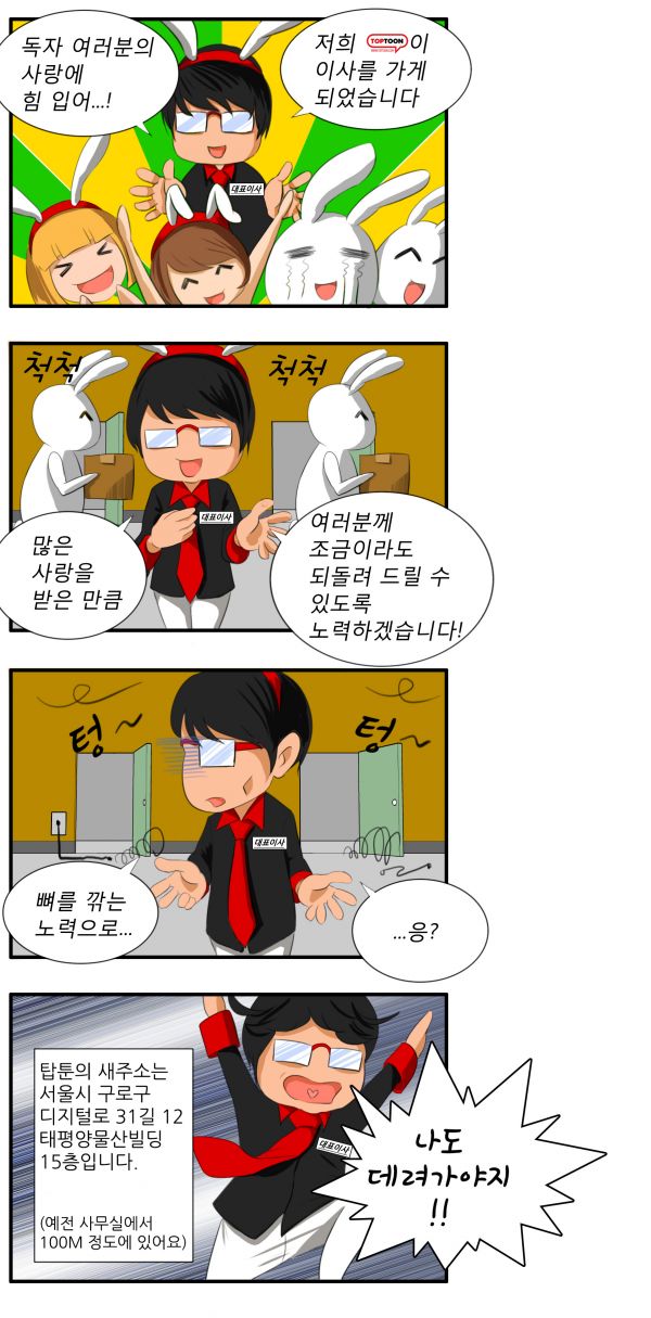 탑코믹스는 사옥을 확장 이전함에 따라 그간 축적된 노하우와 역량을 바탕으로 국내 뿐만 아니라 해외에서 제 2의 한류라 불리는 K툰을 대표하는 웹툰 전문 플랫폼 업체로의 도약을 다짐했다.