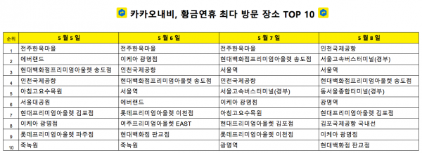 그렇다면 카카오내비 이용자가 가장 많은 길 안내를 받은 곳은 어디일까? 5월 5일 어린이날에는 전주한옥마을, 에버랜드, 현대백화점 프리미엄 아울렛 송도점, 인천국제공항, 아침고요수목원 등을 많이 찾은 것으로 나타났다.