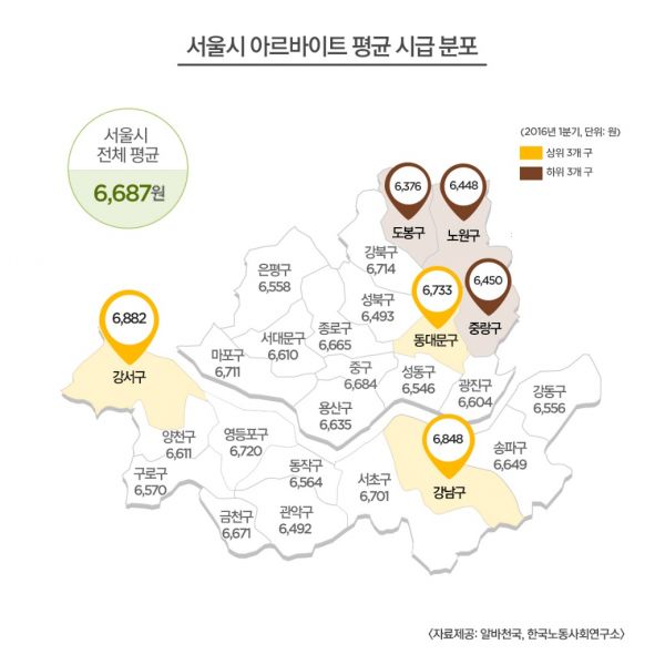 올해 1분기 서울지역 아르바이트 전체 평균시급이 6687원으로 나타났다. 이는 법정최저임금(6030원)보다 657원 높고, 전국 평균(6475원)보다 211원 높다.