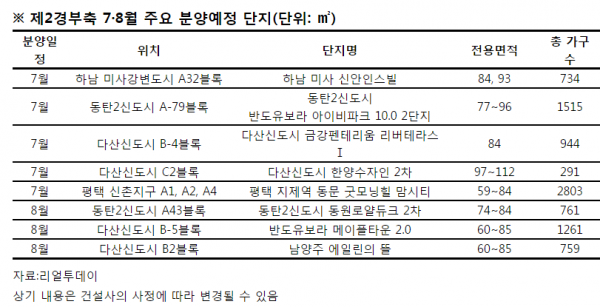 5일 부동산 전문 리서치업체 리얼투데이 조사에 따르면 오는 7·8월 제2경부축의 주요 지역인 미사강변도시, 동탄2신도시, 다산신도시 등에서 총 1만119가구가 분양될 예정이다. 지난해 같은 기간보다 123%(4524→1만119가구)나 증가한 수치다.