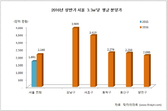 6일 부동산포털 닥터아파트에 따르면 올해 1월~6월 서울 아파트 분양가는 지난해 동기 분양가 1691만원보다 469만원이 올라 평균 27.7% 상승했다.
