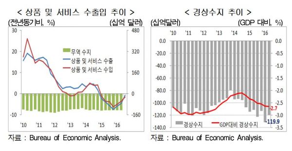 미국의 상품 및 서비스 수출입은 2015년 4/4분기를 저점으로 감소폭이 점점 둔화되고 있다. 수입 증가세의 반영으로 경상수지 적자는 2013년 4/4 분기 799억 달러(약 90조 원)에서 2016년 2/4분기 1199억 달러(약 134조 원)로 확대됐다.